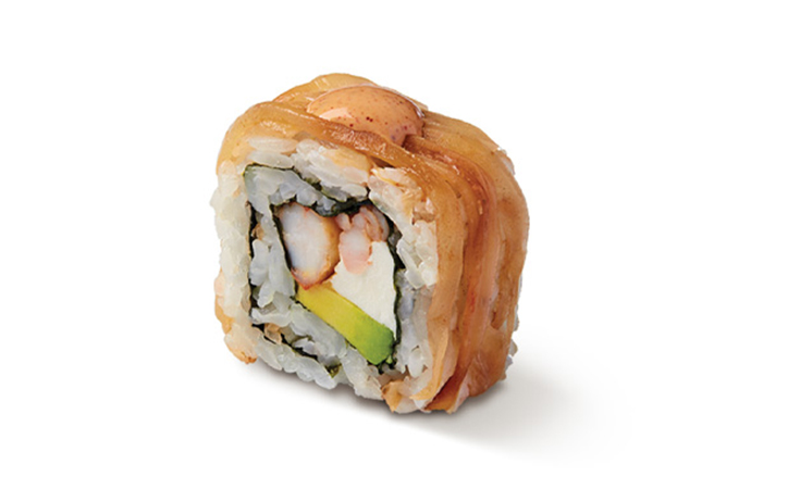 El rollo del Centro Dentro: Camarón al ajillo 20g, queso crema y aguacate. Fuera: cebolla asada. Servido: Con salsa chipotle.